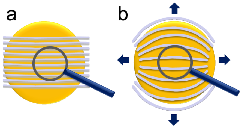 (a) Scheme of the density of polymer backbones of a flat surface. (b) After swelling of the surface area, the density of the polymer backbone is decreased.