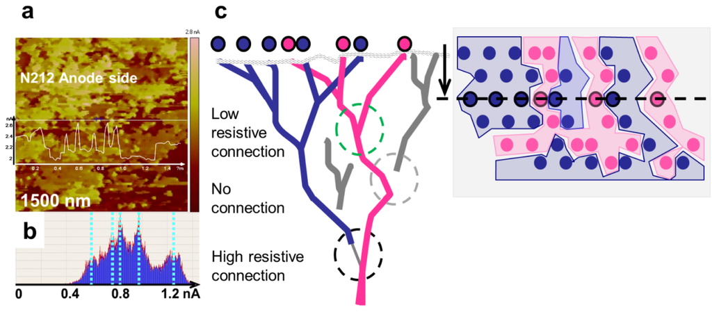 The white spots inside these areas with high adhesion coincide with current spots. Small water droplets most likely decorate the openings of the conductive channel and lead to these high adhesion forces between water and the AFM tip, which has been demonstrated for a comparable material [23]. In most of the conductive network, no water droplets are visible at the surface, which can be explained by a faster evaporation of smaller droplets due to the considerable heating at current densities of 0.8 nA associated with heat generation from the reaction enthalpy of water formation. Another possible explanation originates from the finite sampling steps, where the maximal adhesion force might not be measured if the tip does not touch the channel centrally. The difference in the mechanical properties of conductive and non-conductive areas is caused by the existence of water pressure associated with the current flow. In all of the measurements, heterogeneity of the conductivity was observed and statistically distributed areas were always found without any current. No principle argument can be made for a chemical and structural difference on a scale much larger than the phase separation of Nafion®. Therefore, these observed non-conductive areas might be part of a non-activated subnet that may have a high resistive connection to a conductive part of the network; alternatively, it may also indicate an isolated subnet. In other measurements, an indication of the existence of differently conductive subnets was observed. In this case, a highly conductive membrane measured after fuel cell operation exhibited large conductive areas with a few different defined current levels, and the conductive areas formed an interpenetrating network [32]. In Figure 12a, the current image at the inner interface of the anode side of a N212 half-MEA measured after disassembly is shown [33]. As evident in the current histogram (Figure 12b), a few distinct current levels are observed that interpenetrate each other. A possible explanation is given in the scheme in Figure 12c. Distinct current levels indicate connected subnets, which have either no connection or a highly resistive connection beneath the surface. The existence of areas without any current even after operation of the fuel cell may indicate that, during operation, some parts of the membrane are not participating in the conduction. These parts may be a subnet that is completely isolated from a continuous network. Conceivably, under steady-state conditions, some areas may stay dry because a low-resistive network has been established that does not change at larger scale or because subnets exist that do not have a connection to a conductive path. We have previously observed that higher humidity and temperatures decrease the size and density of non-conductive areas [34,35]. At present, it has not been possible to verify if a certain part of the surface area is still non-conductive under fuel cell operating conditions of 60–80 °C. Measurements conducted at the operating temperature, which are underway, may clarify this matter.