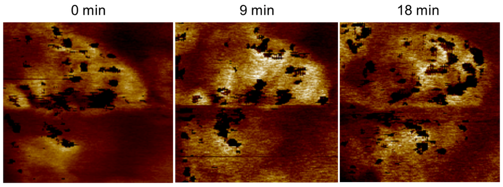 Figure 13 shows the stiffness (DMT modulus) maps with subtracted current images (black spots). The size of the conductive area (high stiffness) increases with time from a diameter of 115 to 140 nm after 9 min and to 190 nm after 18 min. Upon closer inspection, the black spots inside this area change with time. Obviously, the conductive openings at the surface are also changing with time. As evident in the stiffness image, the stiffest areas are located between the conductive spots. Directly at the position of current flow, the stiffness is somewhat smaller. Based on these observations, the existence of a conductive subnet connected beneath the surface can be concluded. The change in the conductive spots may then be interpreted as a frequent change in the actual conductive branch of this subnet: under high pressure of water from beneath (no current flow yet); a high stiffness first occurs before an opening is created at a certain pressure. Subsequently, under current/water flow, the pressure decreases, and, after a certain time, the opening may close; at this point, the current/water now emanates from a neighboring branch. The closing may be caused by a pressure drop due to another active branch or due to drain from the conductive network. The observation of a finite dynamic in the conductive network, even at room temperature, has been previously reported [23]. The size of the whole area increases with the pressure of the water flow. When the membrane dries due to diminished water supply from the back electrode, the swelling of the conductive area decreases almost completely; however, some of the conductive areas remain active until the conductivity drops completely.