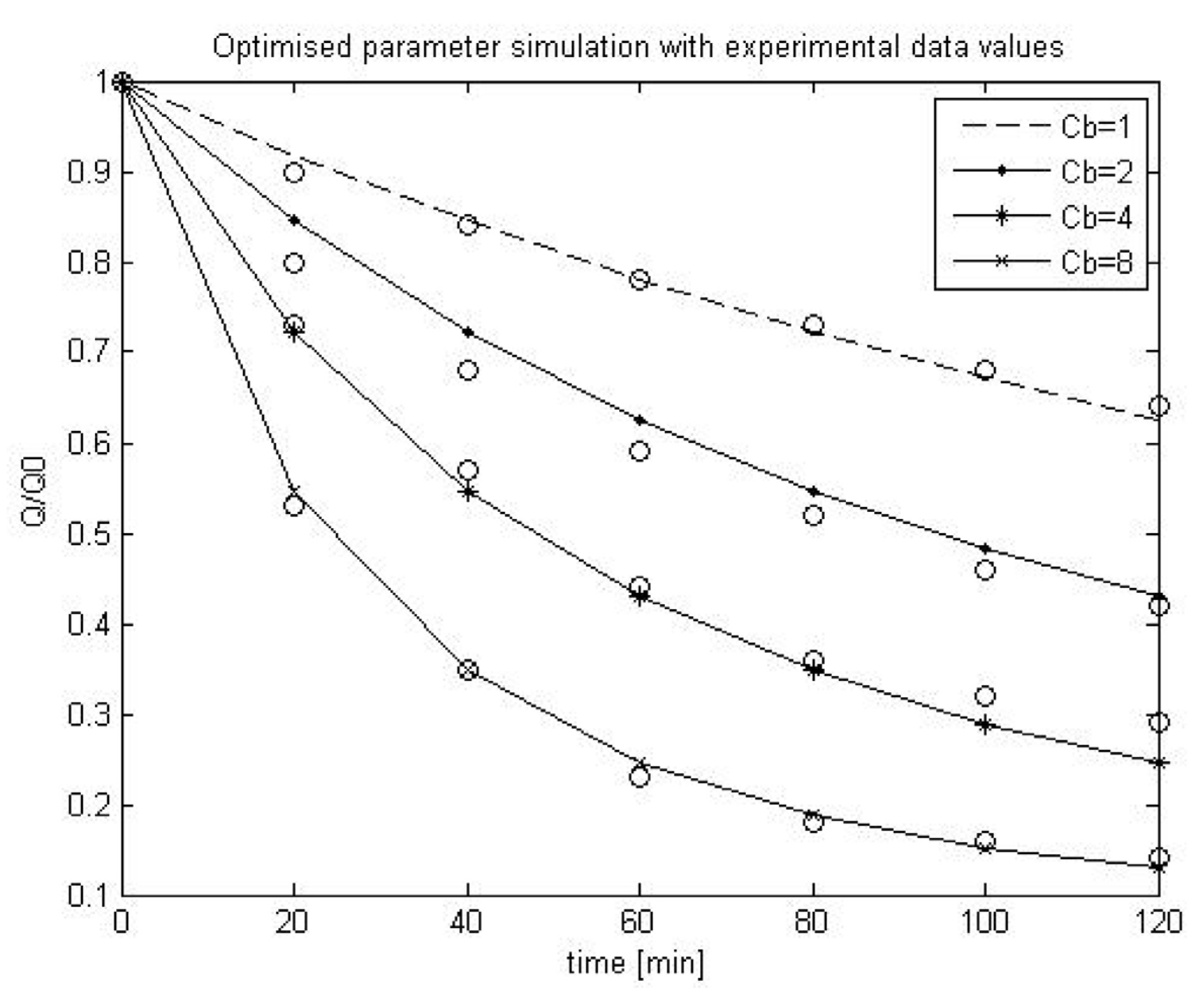 The accuracy of this modified approach was confirmed using the experimental data from the Duclos-Orsello paper [19] and by producing a Matlab/SIMULINK© model of this approach. Matlab© was selected since it allows easy parameter optimisation of any formulated model, and this is a very important capability since some of these parameters in a MBR plant would relate to the combined collective influence of several operational factors that impinge on the fouling mechanisms. Consequently the experimental data and parameter values from the Duclos-Orsello paper [19] were used in the modified model formulation. The solution was slightly different than from the original paper’s results. However by using the SIMULINK© Genetic Algorithm Toolbox, the pore blockage parameter, α, the pore constriction parameter, β, and the fractional foulant specific cake layer resistance, f′R′, were made to fit the normalised flow rate data as shown in Figure 1. In Figure 1, the circles represent the measured normalised flow rate values and the lines the fitted dynamic model values using optimised parameters found by the genetic algorithm (GA) routine. Hence this modified model formulation would allow the creation of a plant layout with a practical fouling model that could be validated and calibrated using the real life plant’s own measured data. This is a huge improvement on the original model formulation which was set up only for a laboratory analysis situation.