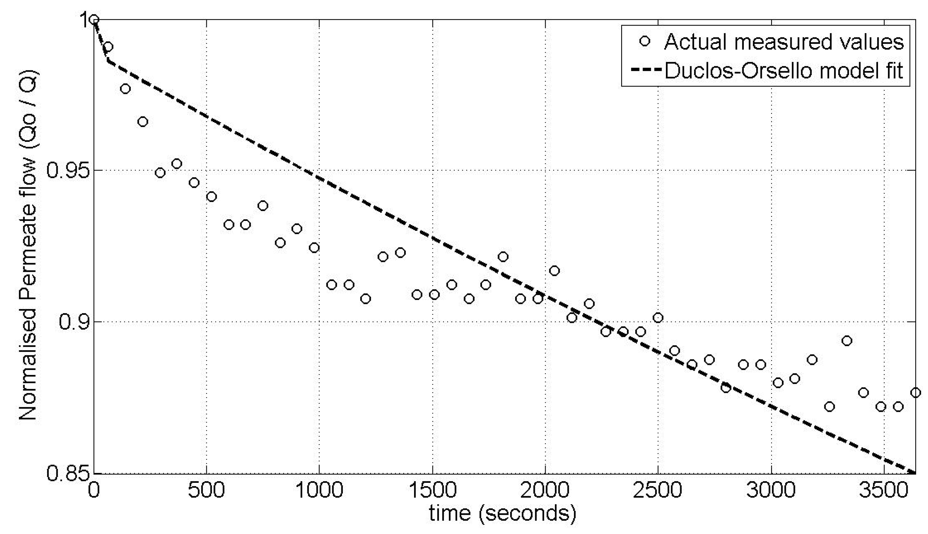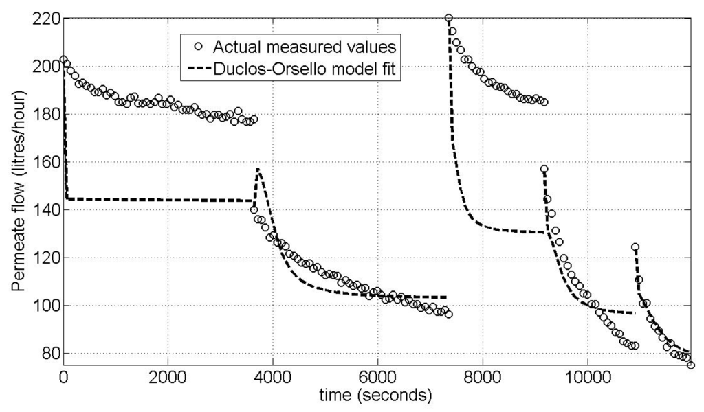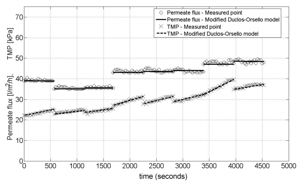 Pilot MBR plant—Modified Duclos-Orsello model fit for single flux step validation.