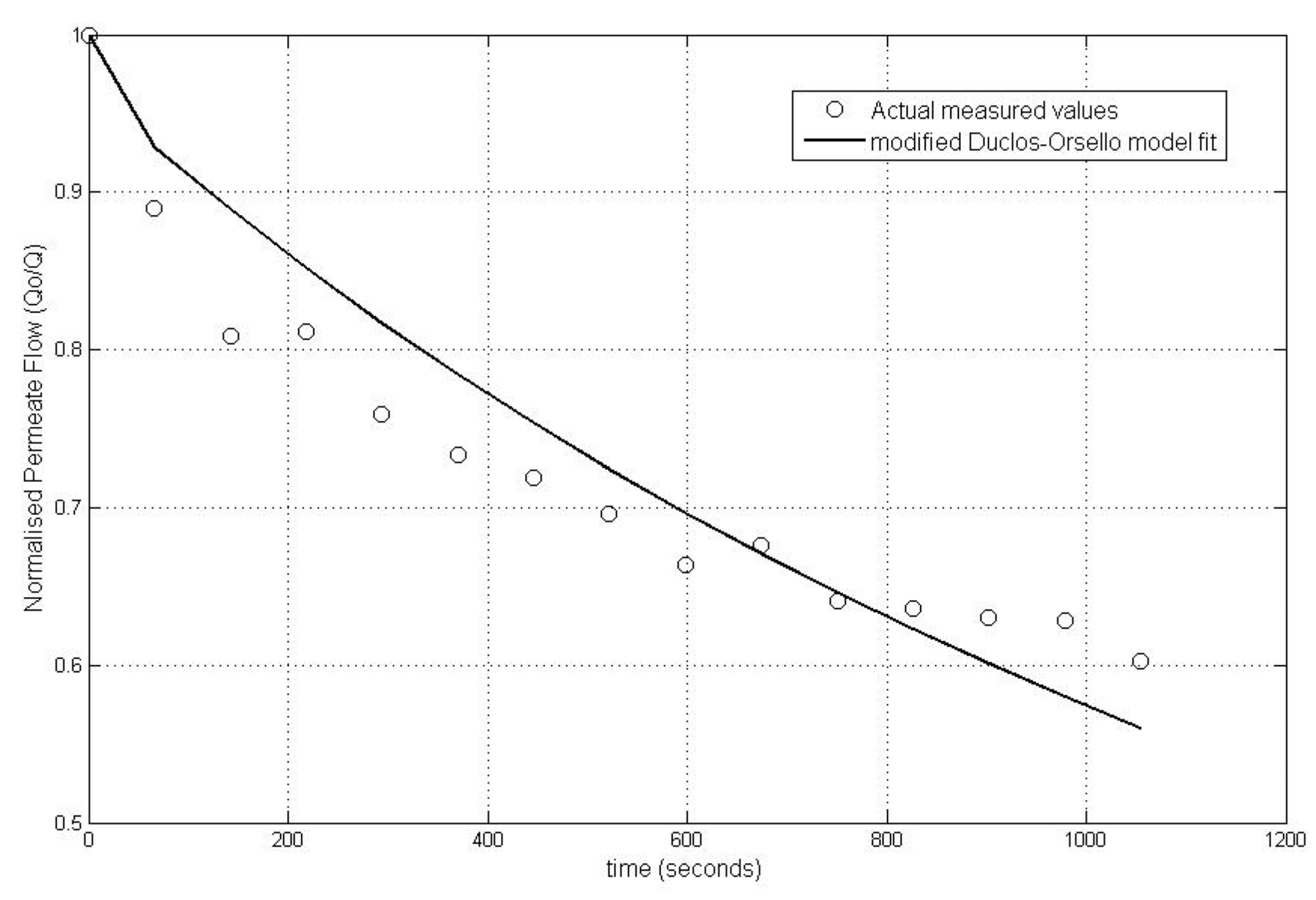 Pilot membrane filtration unit—best Modified Duclos-Orsello model fit for 8 flux steps.