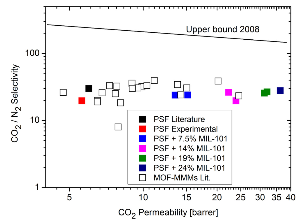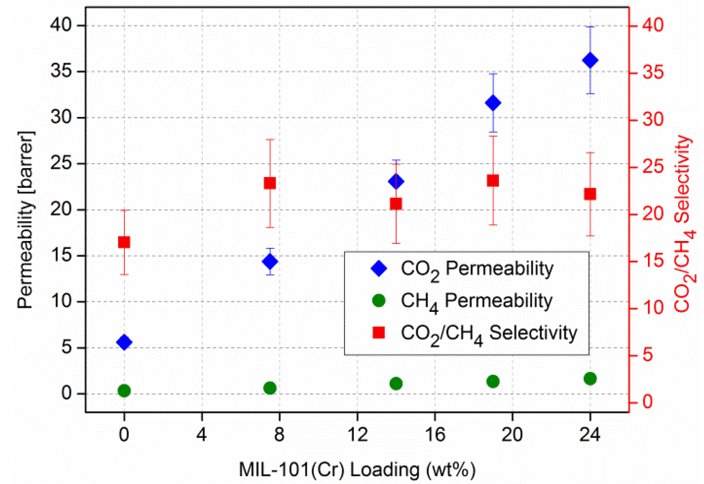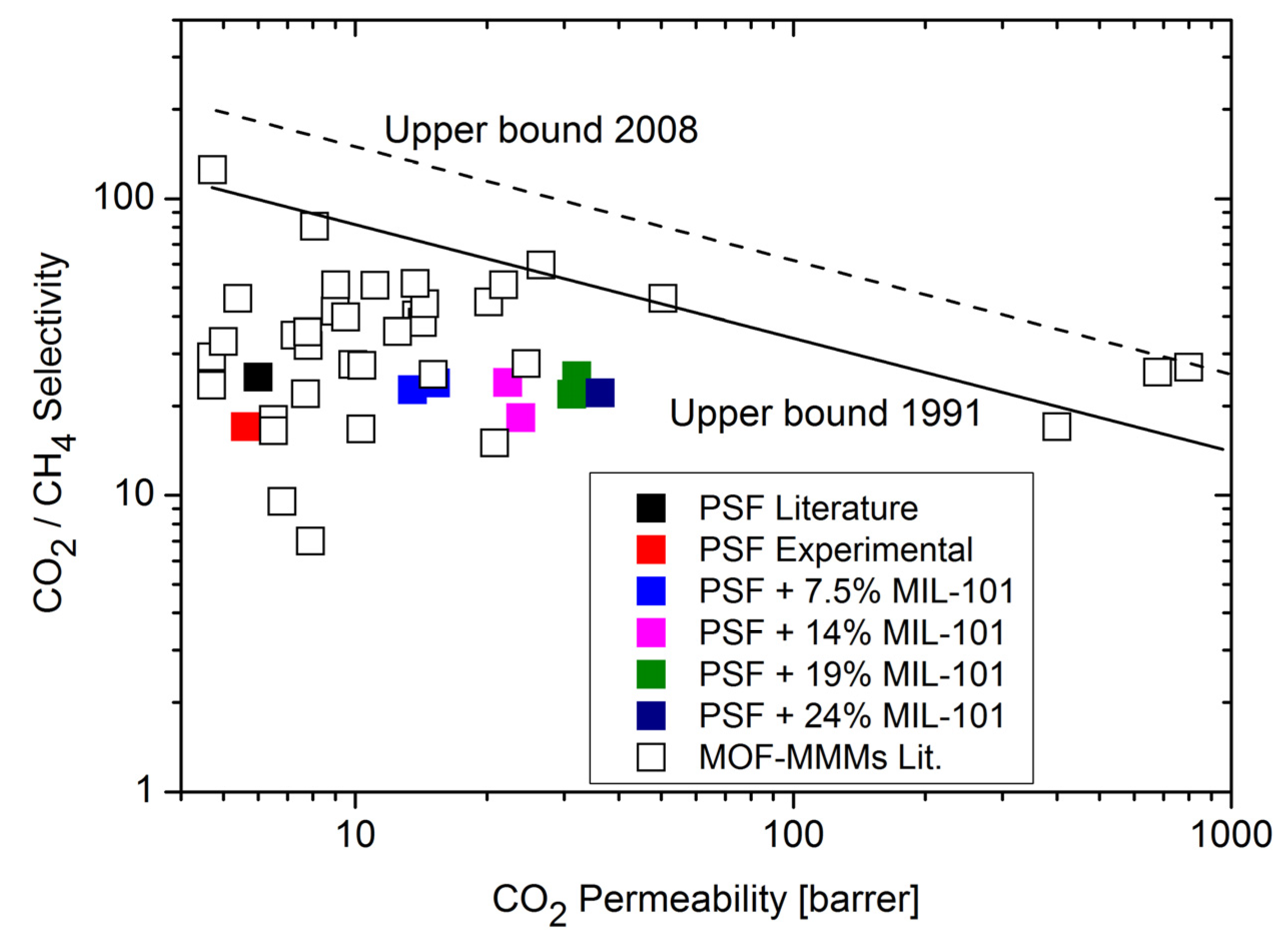 - MIL-101 mass fractions in the MMM had been erroneously calculated somewhat too high in reference [85]. Instead of 8, 16 and 24 wt % the correct mass fractions are 7.5, 14 and 19 wt %, respectively for MIL-101 in PSF. This recalculation does not change the conclusions drawn in reference [85]. To the contrary, the increase in permeability is already achieved with even lower MIL-101 mass fractions.