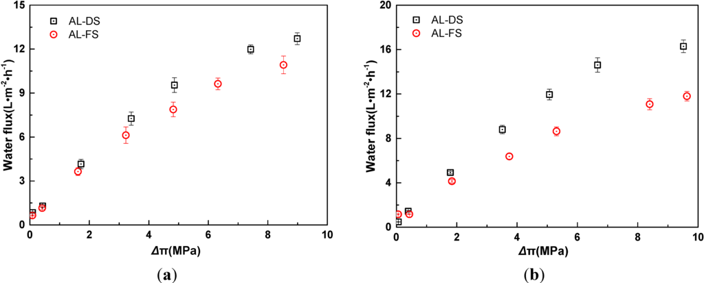 Relationship of water flux and osmotic pressure difference in two membrane orientations for KCl as draw solute (t = 25 °C). AL-DS: active layer facing the draw solution; AL-FS: active layer facing the feed solution. (a) Cd/Cf = 8; (b) Cf = 0.01 M. The osmotic pressure difference refers to the effective values after correction for the effect of external concentration polarization (ECP).