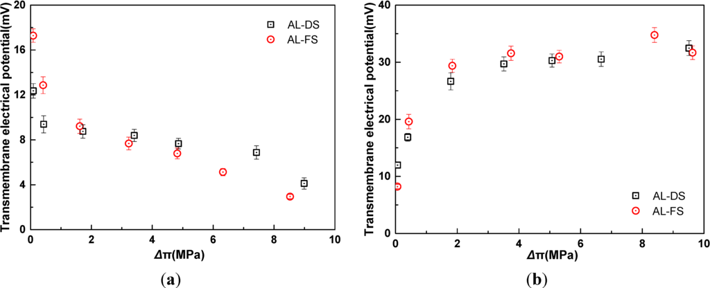 Relationship of transmembrane electrical potential and osmotic pressure difference in two membrane orientations for KCl as draw solute (t = 25 °C). AL-DS: active layer facing the draw solution; AL-FS: active layer facing the feed solution. (a) Cd/Cf = 8; (b) Cf = 0.01 M. The osmotic pressure difference refers to the effective values after correction for the effect of ECP.