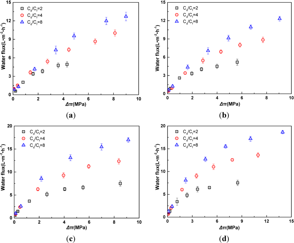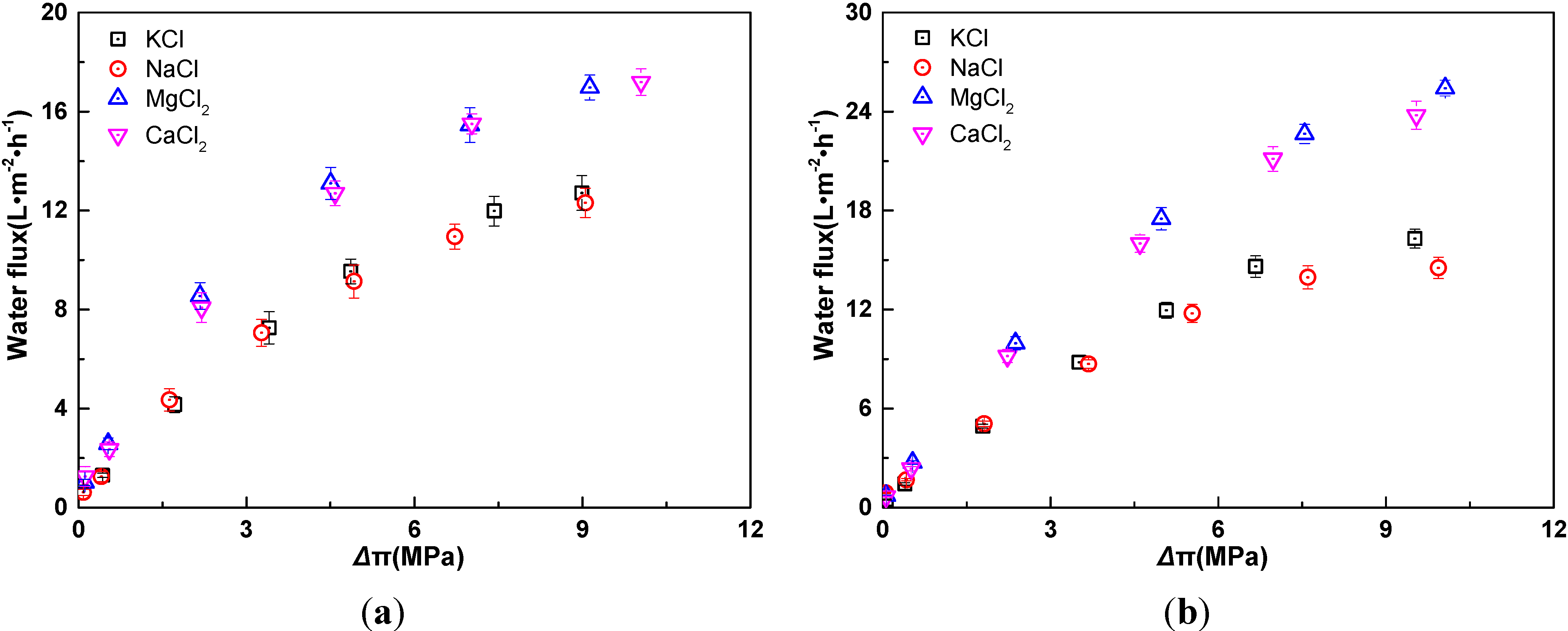 As shown in Figure 3, water fluxes for four electrolytes enhance with the increase of osmotic pressure difference and have the same trend with the increase of the concentration ratio between draw solution and feed solution. At the same osmotic pressure difference, the decrease of the concentration ratio would lead to more serious ICP, and then results in a lower water flux.