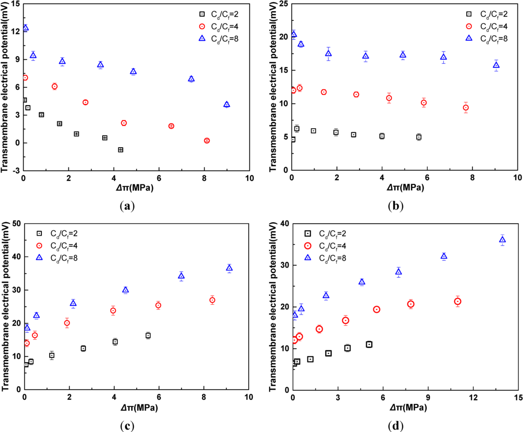 Relationship of transmembrane electrical potential and osmotic pressure difference with different ratio of feed concentration and draw concentration in AL-DS mode(t = 25 °C). (a) KCl; (b) NaCl; (c) MgCl2; (d) CaCl2. The osmotic pressure difference refers to the effective values after correction for the effect of ECP.