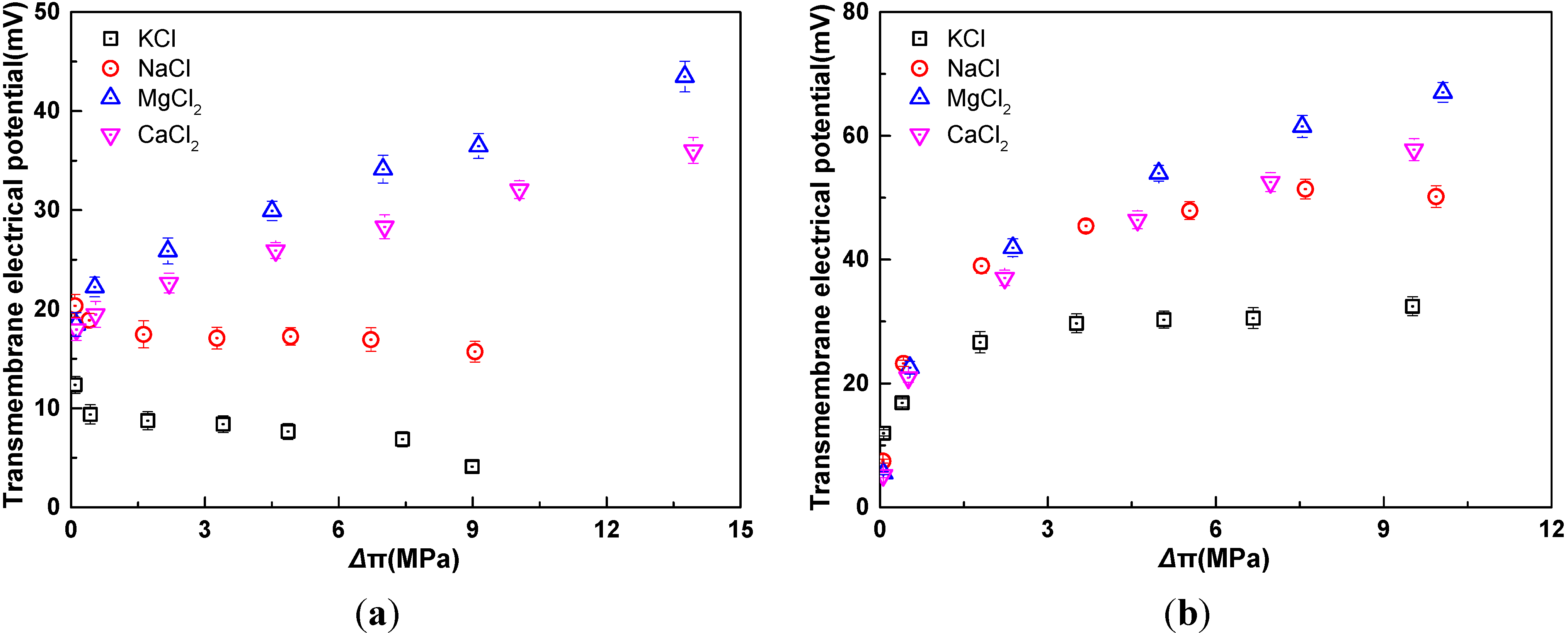 As indicated in Figure 6, the electrolyte species have significant effect on TMEP. The diffusion coefficients of K+, Na+, Mg2+, Ca2+, and Cl− are 1.96 × 10−9 m2/s, 1.33 × 10−9 m2/s, 0.705 × 10−9 m2/s, 0.793 × 10−9 m2/s, and 2.03 × 10−9 m2/s, respectively [28]. Therefore, the order of ions diffusion coefficient is Mg2+ < Ca2+ < Na+ < K+ < Cl−. The more the difference of diffusion coefficients between the cation and anion is, the more diffusion potential would be, so the order of diffusion potential is MgCl2 > CaCl2 > NaCl > KCl. On the other hand, the water flux generated by MgCl2 and CaCl2 solutions is relatively larger than that by KCl and NaCl solutions, which leads to the larger convection potential. However, the increment of the convection potential is lower than that of the diffusion potential. Moreover, as the concentration of electrolytes rises, Donnan potential becomes low and contributes little to the TMEP. Therefore, at the same osmotic pressure difference, the TMEP decreases in the following order: MgCl2 > CaCl2 > NaCl > KCl. In Figure 6a, another interesting phenomenon is that the TMEPs of univalent and bivalent salts show diverging trends. For univalent salts, the TMEPs decrease with the increase of effective osmotic pressure difference. Conversely, for bivalent salts, the TMEPs increase with the increase of effective osmotic pressure difference. This phenomenon can be interpreted by the following explanation.