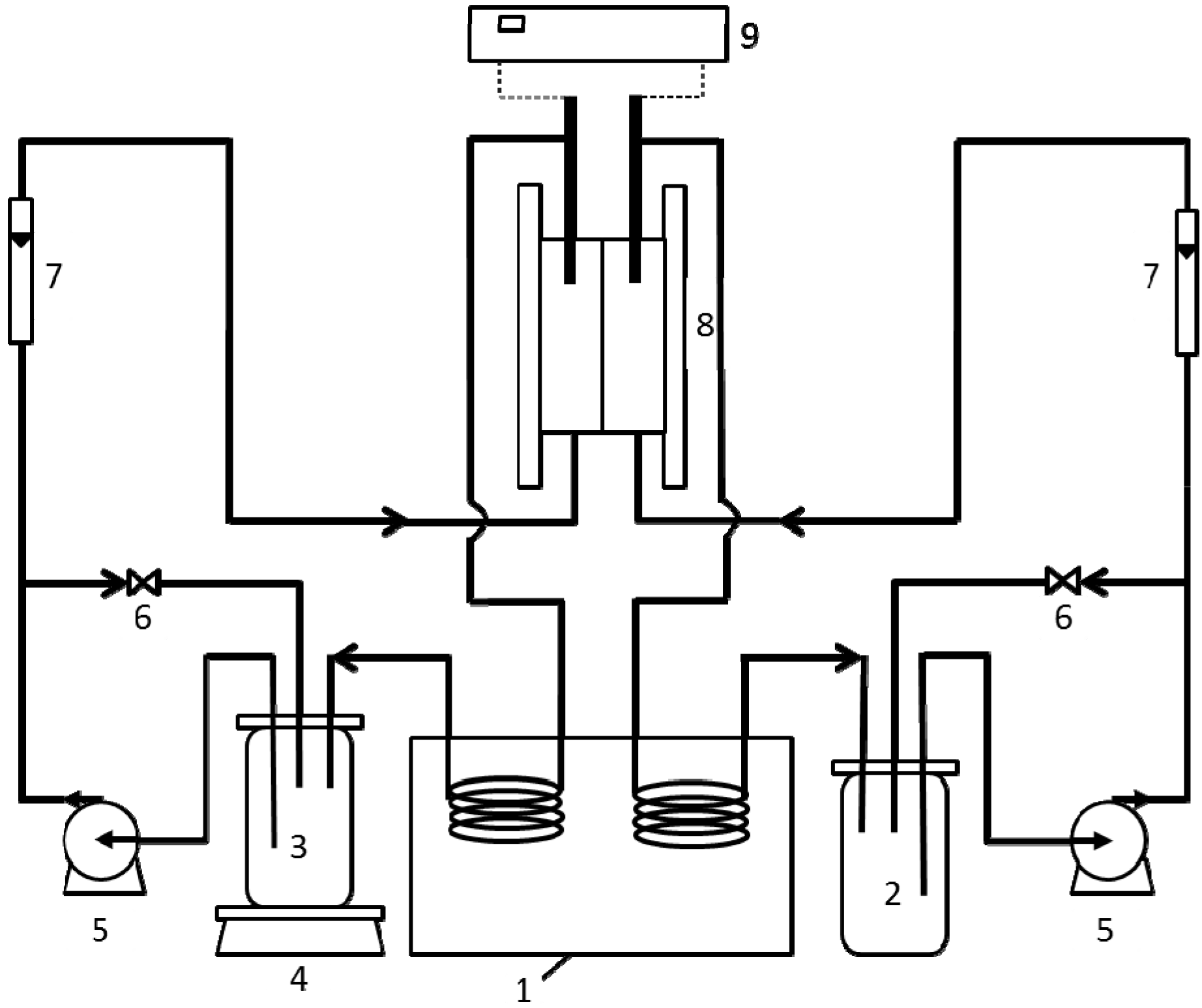 Schematic diagram of FO setup: (1) water bath; (2) draw solution; (3) feed solution; (4) electronic balance; (5) diaphragm pump; (6) valve; (7) flow meter; (8) membrane module; (9) multimeter.