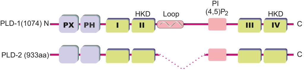 Domain structure of mammalian phospholipase D (PLD) isoforms. The PLD isoforms PLD1 (1074 amino acids) and PLD2 (933 amino acids) contain N-terminal PX and PH domains and the highly conserved domains I–IV. The domains II and IV contain HKD sequence motifs that are necessary for catalytic activity. N-terminal to domain III is a well conserved basic sequence that binds PI(4,5)P2. PLD1 is distinguished by a loop region that seems to contribute to the regulation of PLD1 activity.