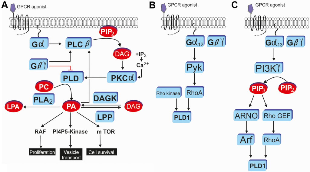 G protein coupled receptor induced PLD activation and phosphatidic acid (PA) mediated signaling through Gαq and protein kinase C (A); Gα12 and RhoA (B); and Gα13 and Arf (C). Modified from Selvy et al. [11].