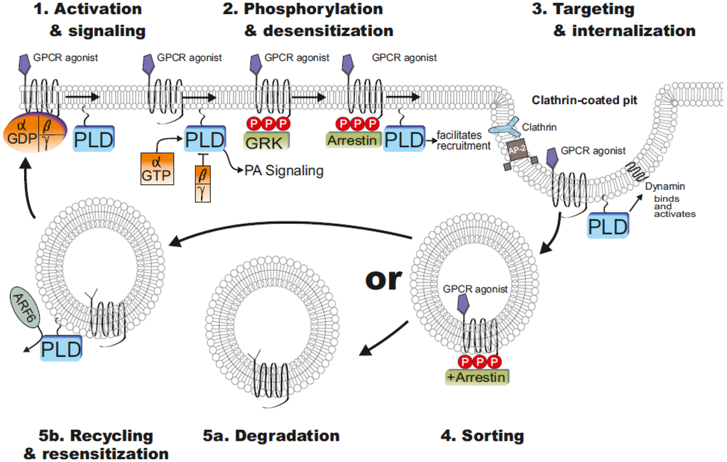 Regulation of G protein coupled receptor (GPCR) trafficking. Agonist binding to GPCRs leads to receptor activation, G protein coupling, and signal transduction including PLD activation. For example, whereas Gα12/13 class of heterotrimers or small G proteins such as ARF6 activates PLD, Gβγ subunit of the heterotrimer can directly inhibit PLD (step 1). G protein receptor kinases (GRKs) then phosphorylate the agonist-activated GPCR on intracellular domains, initiating arrestin recruitment. Arrestin binding to the receptor inhibits G protein coupling and terminates signaling, a process termed desensitization. PA-mediated increase of PI(4,5)P2 level facilitated recruitment of Clathrin, dynamin and proteins of the AP-2 adapter complex (step 2). Receptor/arrestin complexes are then targeted to clathrin-coated pits, where arrestin forms a multicomponent complex with clathrin, adapter protein-2 (AP-2), and phosphoinositides, resulting in receptor internalization. PLD directly interact with dynamin and it was suggested that PLD2 might serve as a GTPase activating protein (GAP) for dynamin (step 3). Internalized GPCRs are sorted (step 4) to degradation (step 5a) or recycling/resensitization (step 5b) compartments. ARF6 appears to be involved in the PLD mediated recycling. For details please see the paragraphs. Modified from Moore et al. [70].