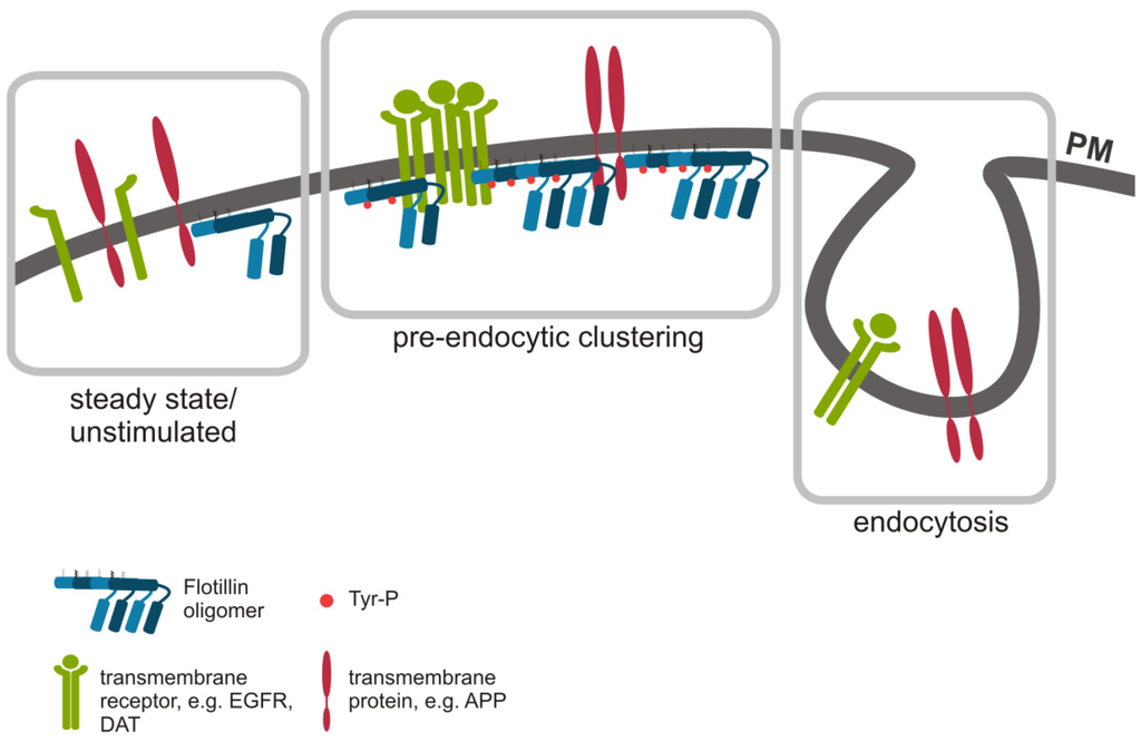 Flotillin assisted endocytosis. Flotillin microdomains are dynamic, and upon certain stimuli, flotillins form higher order oligomers that can recruit transmembrane proteins, such as EGFR, DAT and APP, into flotillin rafts for pre-endocytic cluster formation (middle). Cargo can then be internalized via endocytosis without a direct involvement of flotillins, e.g., by clathrin mediated endocytosis (right). In resting or growth factor deprived cells, flotillins and the cargo may not reside in the same microdomains (left).
