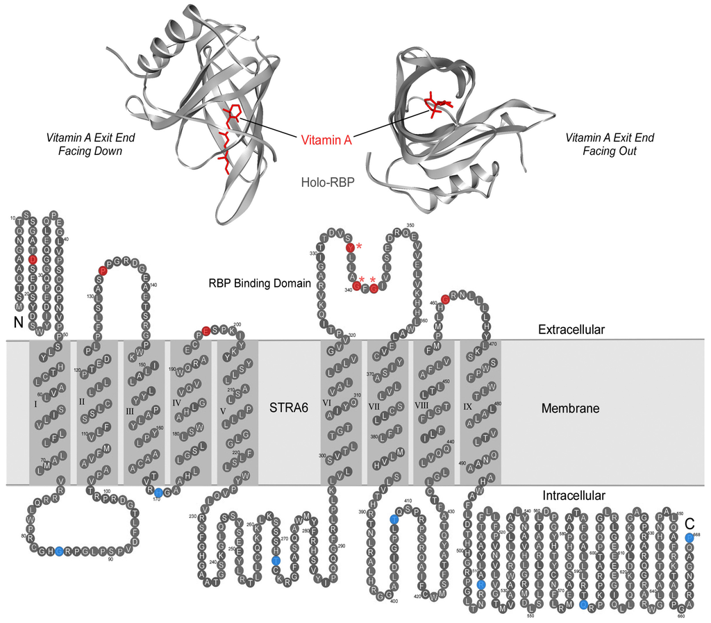 Plasma retinol binding protein and its transmembrane receptor STRA6. A. Crystal structures of holo-RBP with the vitamin A exit end facing down (left picture) or facing out (right picture). B. The transmembrane topology model of STRA6. Residues that have been experimentally confirmed to be extracellular are labeled in red. Residues that have been experimentally confirmed to be intracellular are labeled in blue. The three STRA6 residues essential for RBP binding are labeled with asterisks. A mutation in either one of these three residues is sufficient to abolish RBP binding and vitamin A uptake without affecting STRA6’s cell-surface expression.