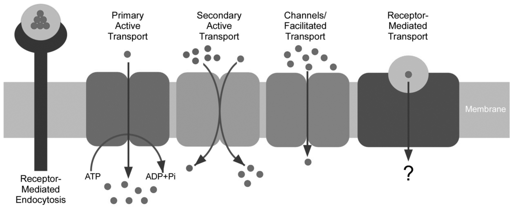 Cells are known to take up extracellular molecules through receptor-mediated endocytosis, primary active transport, secondary active transport, channels and facilitated transport (Figure 2). STRA6-mediated vitamin A uptake is not an example of primary active transport because STRA6 has no ATP binding domain. The fact that metabolic inhibitors do not stop the uptake process, and that the uptake happens efficiently in a cell-free system without any energy source [33] argues against any mechanism that depends on cellular energy. The only remaining possibility is channel/facilitative transport, which depends on the electrochemical gradient of the free ligand. However, STRA6’s transport substrate is not free but is bound with high affinity to its binding protein to form a 1:1 complex (the definition of holo-RBP). Independent studies have shown that STRA6 does not facilitate the uptake of free retinol by LRAT [37] or CRBP-I [38]. Therefore, STRA6’s mechanism is distinct from all known cellular uptake mechanisms (Figure 2).