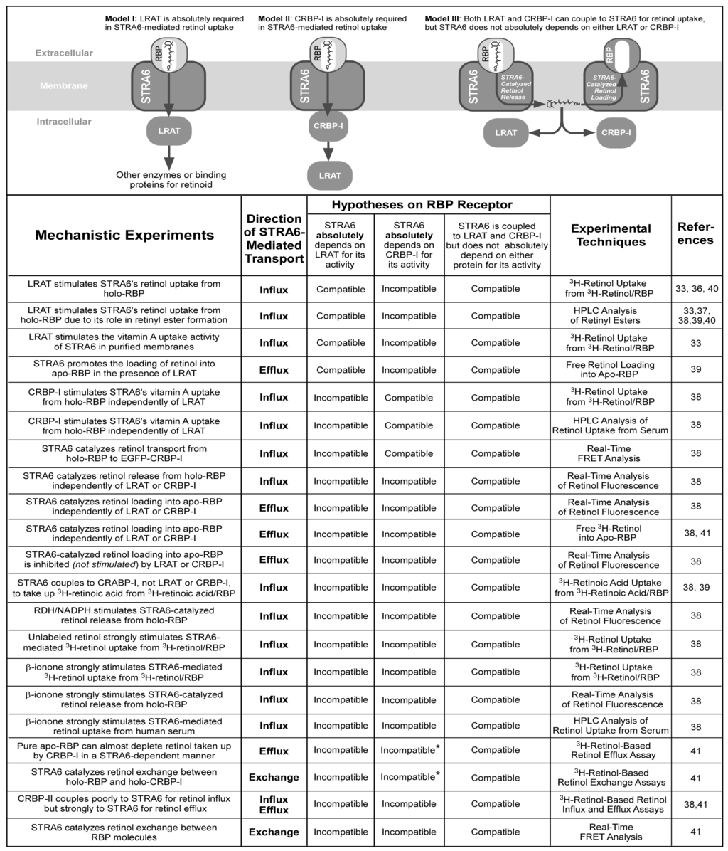 Major hypotheses on the mechanism of STRA6-mediated cellular vitamin A uptake from holo-RBP and experimental evidence that is compatible or incompatible with these hypotheses. Evidence revealed by diverse mechanistic experiments argues against the absolute dependence of STRA6 on either LRAT or CRBP-I. In the STRA6 activities marked by asterisks, STRA6 catalyzes the removal of retinol from CRBP-I. These activities are also incompatible with models that proposed the absolute requirement of CRBP-I for STRA6’s activity because these models also proposed that only apo-CRBP-I interacts with STRA6.