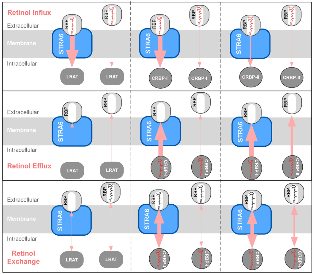 Since retinol influx and retinol efflux are opposing activities, it is important to understand the extracellular and intracellular factors that determine the direction of retinol transport in STRA6 (Figure 5). In retinol influx from holo-RBP, STRA6 couples effectively to LRAT and CRBP-I, but poorly to CRBP-II [38]. In retinol efflux into apo-RBP, STRA6 couples effectively to CRBP-I and CRBP-II, but poorly to LRAT. Pure apo-RBP can completely deplete of retinol taken up by CRBP-I in a STRA6-dependent manner. However, natural blood contains both holo-RBP and apo-RBP. When STRA6 encounters both holo-RBP and apo-RBP, holo-RBP blocks STRA6-mediated retinol efflux by competing with apo-RBP’s binding to STRA6 and by counteracting retinol efflux with influx [41]. In STRA6-catalyzed exchange between extracellular holo-RBP and intracellular retinoid pool, STRA6 again couples effectively to CRBP-I and CRBP-II, but poorly to LRAT. Although the function of STRA6’s retinol exchange activity between intracellular CRBP-I and extracellular RBP is not known, it may serve to refresh the intracellular retinoid pool.