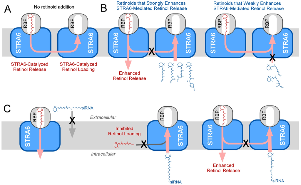 Schematic diagrams of the effects of retinoids on STRA6’s activities. A. The key activities of STRA6 are to catalyze retinol loading into apo-RBP and retinol release from holo-RBP. B. Fenretinide, all-trans retinal, all-trans retinoic acid and 13-cis retinoic acid more effectively stimulates STRA6-mediated retinol release and inhibits STRA6-mediated retinol loading than 9-cis retinol, 9-cis retinal and 9-cis retinoic acid. C. Schematic diagram of the effects of retinol-siRNA on STRA6’s activity. When added extracellularly, retinol-siRNA has no effect on STRA6-mediated vitamin A uptake from holo-RBP. However, retinol-siRNA potently stimulates STRA6-mediated retinol release and suppresses STRA6-mediated retinol loading when added to membranes that express STRA6.