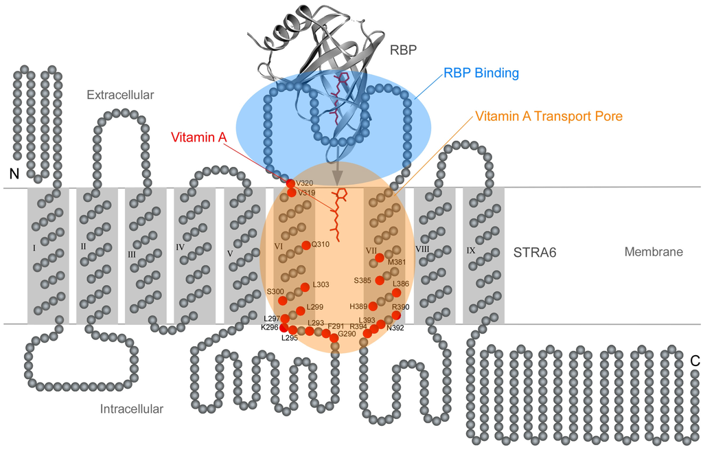 Schematic diagram of the locations of key positions in STRA6 whose acute modifications block vitamin A transport by STRA6. The transmembrane topology model of STRA6 is depicted together with the crystal structure of holo-RBP. STRA6’s key RBP binding domain is shaded in blue. The transmembrane domains and adjacent regions that are known to be part of the vitamin A transport pore are shaded in orange. Residues whose acute modification impedes vitamin A transport by STRA6 are represented as red circles. This figure is based on Figure 9 of reference 67.