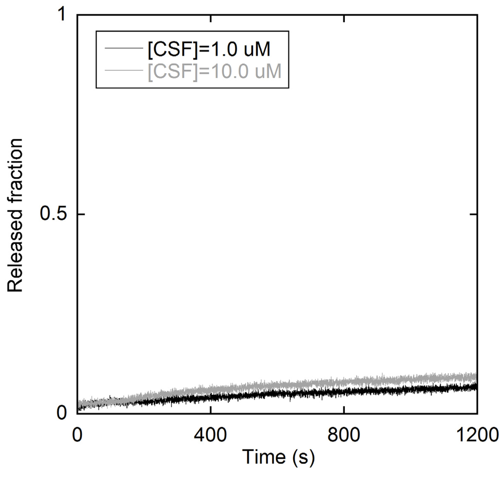Kinetics of calcein release after addition of the type I’ β-turn peptide structure CSF114 to a LUV suspension. [Lipid] = 50 µM and [Peptide] = 1.0 µM and 10.0 µM.
