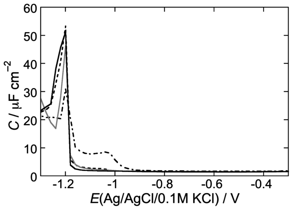Hence, the absolute potential difference Δφ across a mercury-supported lipid monolayer, which can be viewed as a “transmembrane potential”, is roughly estimated by increasing the potential difference measured vs. the Ag/AgCl/(0.1 M KCl) reference electrode by about 200 mV. The approximate expression of Equation (2) is similar to a more general expression relying on more accurate extrathermodynamic considerations [35]. It serves to show that the absolute potential difference across a mercury-supported phospholipid monolayer, which is equivalent to a “transmembrane potential”, falls within the range of physiological values over the more positive portion of the region of minimum capacitance.
