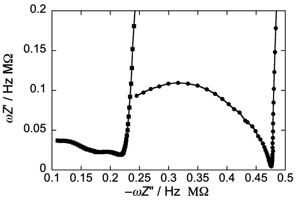 The electrochemical impedance spectrum of this system, when displayed on a plot of ωZ’ against −ωZ” (M plot), exhibits a single distorted semicircle in the absence of CSF114, as shown at −0.40 V by the solid circles in Figure 8. Z’ and Z” denote the in-phase and quadrature component of the impedance, and ω is the angular frequency. Addition of 2 μg/mL CSF114 generates an additional small semicircle (solid squares in Figure 8), falling at higher frequencies with respect to the former one. It should be noted that an adsorbed film can be regarded as consisting of a series of different slabs with distinct dielectric properties [44]. Each slab is simulated by a parallel combination of a resistance R and a capacitance C, namely a ‘RC mesh’. On an M plot, a single RC mesh yields a semicircle whose diameter equals the reciprocal of its capacitance. Moreover, the angular frequency ω at the maximum of each semicircle is equal to the reciprocal of the time constant, RC, of the corresponding mesh. The second semicircle in Figure 8 (solid squares) has a much smaller diameter than the first one, ascribable to the DOPC monolayer, and hence a much higher capacitance. Noting that ω increases along the positive direction of the −Z”ω axis, the second semicircle has a time constant lower than that of the first one, and hence a lower resistance, which more than counterbalances its higher capacitance.