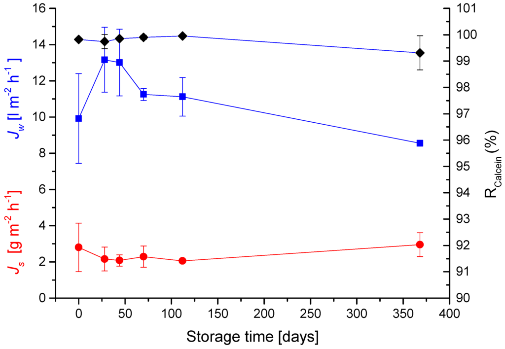 The results shown in Figure 3 demonstrate that biomimetic membranes can be stored for at least a year with no significance decrease in performance.