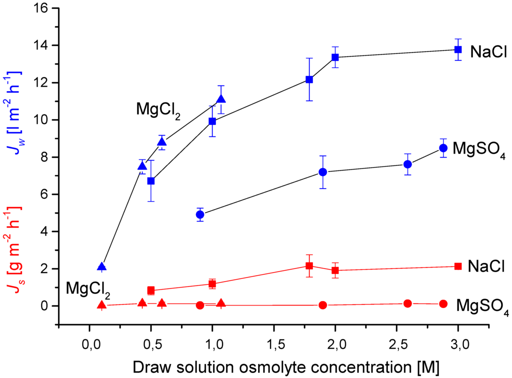 Effects of draw solution on water flux and reverse solute flux. Experiments were made as described for Table 1. Values are presented as mean +/− standard deviation over 900 min with a sampling rate of 5 min−1 (n = 3).