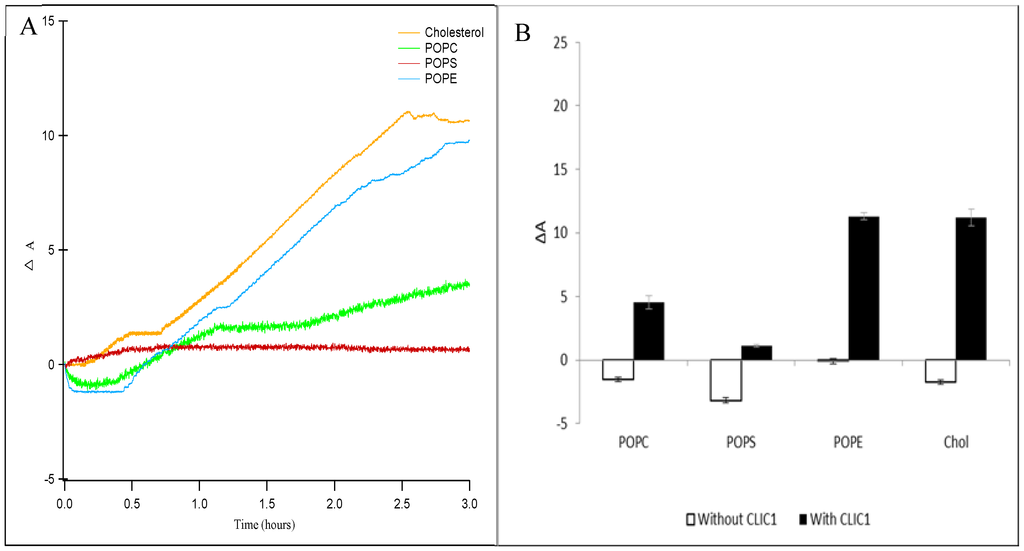 Several conventional studies of binary mixtures of two or more phospholipids have indicated that cholesterol may preferentially associate with different lipid classes in the same mixture [34]. Recent studies have shown clear evidence for the formation of cholesterol-poor or cholesterol-rich microdomains or clusters, which are also enriched or depleted of certain phospholipid classes, which occur in both model and biological membranes [34,35,36]. It was concluded that limiting amounts of cholesterol show comparable or higher affinities for anionic phospholipids than for zwitterionic phospholipids and the order of preference of cholesterol thus established was Sphingomyelin (SM) > Phosphatidylserine (PS) > Phosphatidylglycerol (PG) > Phosphatidylcholine (PC) > Phosphatidylethanolamine (PE) [34,35,36]. Hence, CLIC1 proteins show greater interaction in mixed monolayers containing anionic POPS and cholesterol (Figure 4). The fact that CLIC1 interacts with POPE not POPS (see Figure 2) and also that cholesterol will preferentially form microdomains with POPS over POPE, as a result CLIC1 protein shows greater interaction with POPE:POPS:Chol monolayer (mole ratio 4:1:1) which has a greater mole percent of POPE for CLIC1 interaction in comparison to POPS:POPE:Chol monolayer. It is also not surprising that CLIC1 shows greater levels of insertion to a POPC:POPE:Chol monolayer (ΔA ~9.3 ± 0.3) in comparison to POPE:POPC:Chol monolayer (ΔA ~4.8 ± 0.46%) (See Figure 4, black bars) for such an interaction was evident from the results shown in Figure 2 and Figure 3.