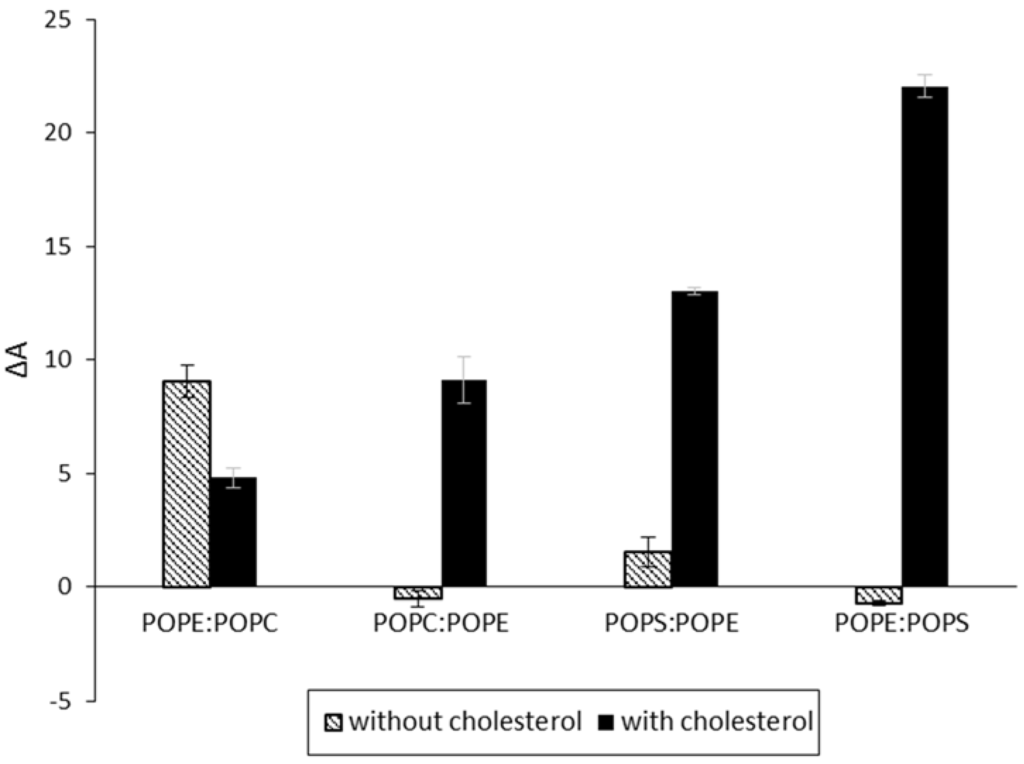 Percent area expansion profiles of monolayers made of different lipid combinations with/without cholesterol (black/white bars) after 3 h of CLIC1 protein injection into the subphase. CLIC1 protein showed significant insertion and/or membrane interactions in POPE:POPS monolayer containing cholesterol. (n = 3)