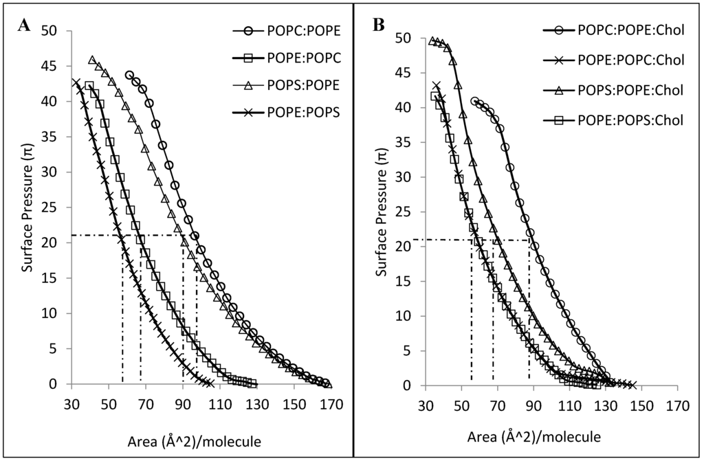 (A) Surface pressure-area isotherms of different lipid mixtures of 5:1 mole ratio (B) Surface pressure-area isotherms of the same lipid mixtures containing cholesterol in a 4:1:1 mole ratio measured with a Langmuir film balance (n = 3).