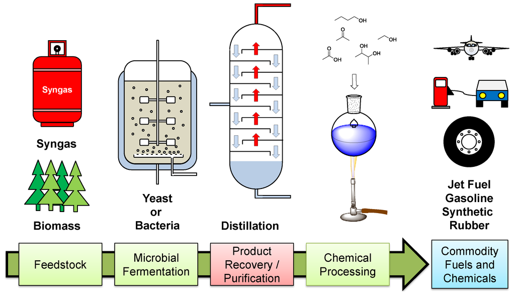 One of the main disadvantages of the process is the downstream separation of the dilute organics from the fermentation broth (Figure 1). This is an energy-intensive process where the fermentative products are recovered from a complex aqueous mixture of metabolites, proteins, salts, sugars, vitamins and other nutrients used as a growth media for the microorganisms. Distillation is still the dominant separation technology; however, due to the low concentrations of products within the broth it requires the heating of large volumes of water, demanding vast amounts of energy and thereby limiting the cost effectiveness of the process. For example, the recovery of 2,3-butanediol (a precursor to synthetic rubber and jet-fuel) from a fermentation broth, can account for over half the cost of its microbial production [1]. Another example is in the recovery of 1-butanol (a potential alternative road transport fuel) [2] from a 1.5–2.5 wt % acetone-butanol-ethanol (ABE) broth. To recover 1-butanol using a distillation process requires approximately 35–52 MJ·kg−1 compared to the energy density of 1-butanol = 36 MJ·kg−1 [3]. Other traditional recovery techniques such as chromatography [4] and crystallization [5] have been investigated as suitable recovery technologies for other less volatile fermentation products. These methods have their own limitations: chromatography can be incredibly expensive to scale-up and recovery via crystallization can only be performed on products that will readily crystallize from water. For these microbiologically produced fuels and chemicals to be competitive within the market, they must be cost-comparable with their crude-oil-derived counterparts. Therefore, there has been much research into alternative separation technologies for the recovery of fermentation products. This review aims to give an outline of the role mixed-matrix membranes are playing in achieving lower energy separations of microbiologically produced fuels and chemicals.