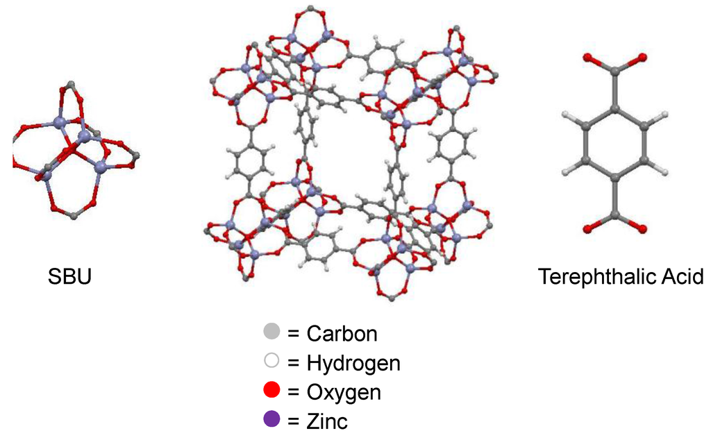 Metal-organic frameworks (MOFs) are a novel type of microporous material (Figure 4). These crystalline materials comprise an organic linker coordinated to a metal or metal oxide cluster (denoted secondary building unit—SBU) [31]. The ability to systematically change the SBU or organic linker allows tailoring of the size and chemical environment of the pores. Widely studied for their gas storage and separation properties, MOFs have received much less attention in their use within liquid separations. For applications within liquid separations, especially those of fermentation broths, MOFs that are chemically stable towards water and organic solvents are required [32]. Although historically MOFs have been highly sensitive to moisture and aggressive media, there are ever increasing examples of robust MOFs that can withstand the conditions required for fermentative separation applications.