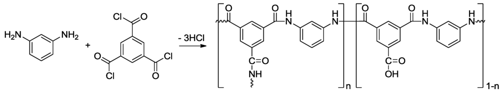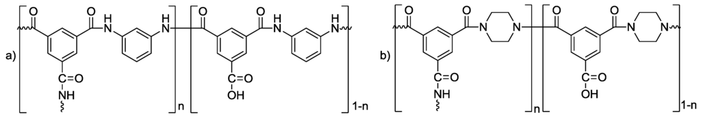 The structures of current commercial polymeric TFC NF and RO membranes have been studied extensively [56,57]. Figure 9a shows the chemical structure of the fully aromatic polyamide used in many commercial RO membranes, such as BW30. The chemical structure of the semi-aromatic polyamide used in many commercial NF membranes, such as NF270, is presented in Figure 9b. Various modifications to the polyamide molecular structure and the effect this has on the trade-off between salt rejection and water permeability has also been extensively studied [58].