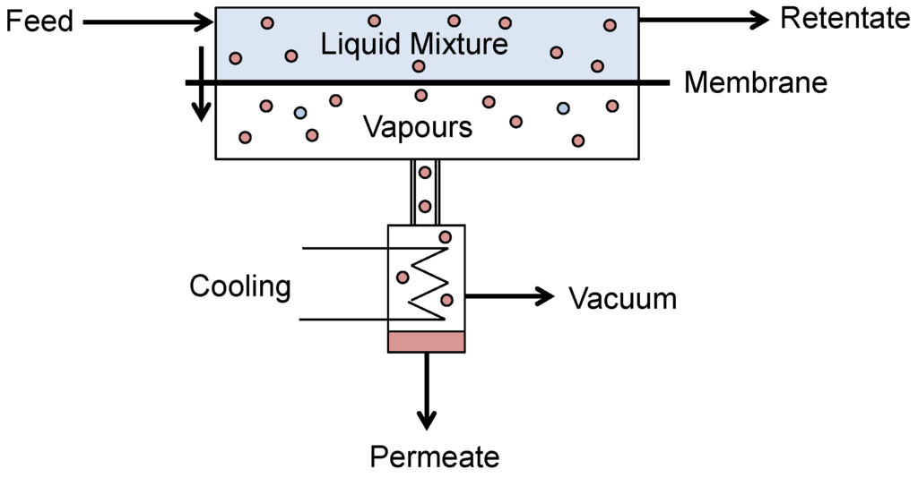 Pervaporation is a membrane process where a difference in partial vapour pressure is the driving force across the membrane, induced by either a vacuum or sweep gas. Pervaporation combines both evaporation and membrane permeation and is unique among membrane separations in that it involves a liquid-vapour phase change [78]. A liquid feed is contacted with one side of the membrane and vapour is withdrawn from the other (Figure 11).