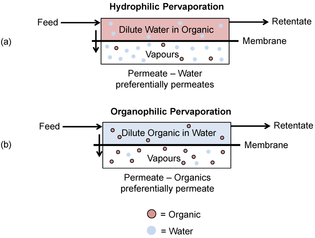 Pervaporation for the recovery of fermentation products can be split into two main processes: hydrophilic pervaporation and organophilic pervaporation (Figure 12).