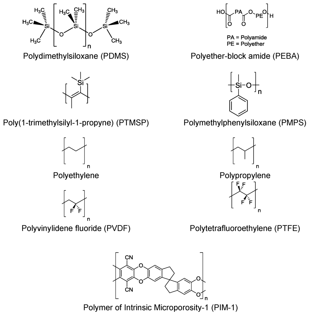 For organophilic pervaporation hydrophobic polymers are utilized. These polymers possess few or no polar functional groups that exhibit an affinity for water. Examples of polymers utilized for organophilic pervaporation are presented in Figure 14.