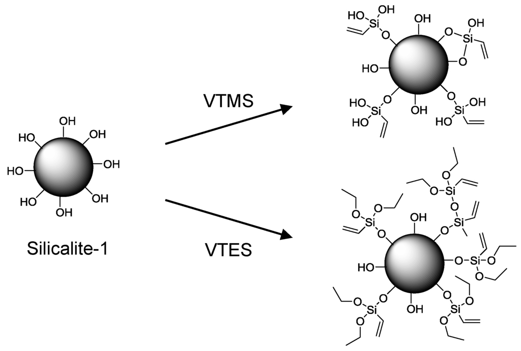 - Zhou, H.; Su, Y.; Chen, X.; Yi, S.; Wan, Y. Modification of silicalite-1 by vinyltrimethoxysilane (VTMS) and preparation of silicalite-1 filled polydimethylsiloxane (PDMS) hybrid pervaporation membranes. Sep. Purif. Technol. 2010, 75, 286–294. [Google Scholar] [CrossRef]