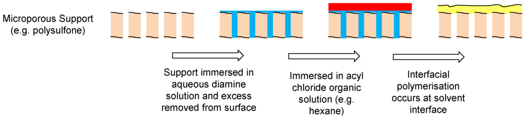 The majority of current commercial polymeric NF and RO membranes consist of a thin-film composite (TFC) structure as shown in Figure 8 [55]. A woven or non-woven support (typically a polyester) is used as a support for a microporous polymer such as polysulfone upon which there is an ultrathin barrier layer of polymer (most commonly polyamide) that controls the rejection characteristics of the membrane.
