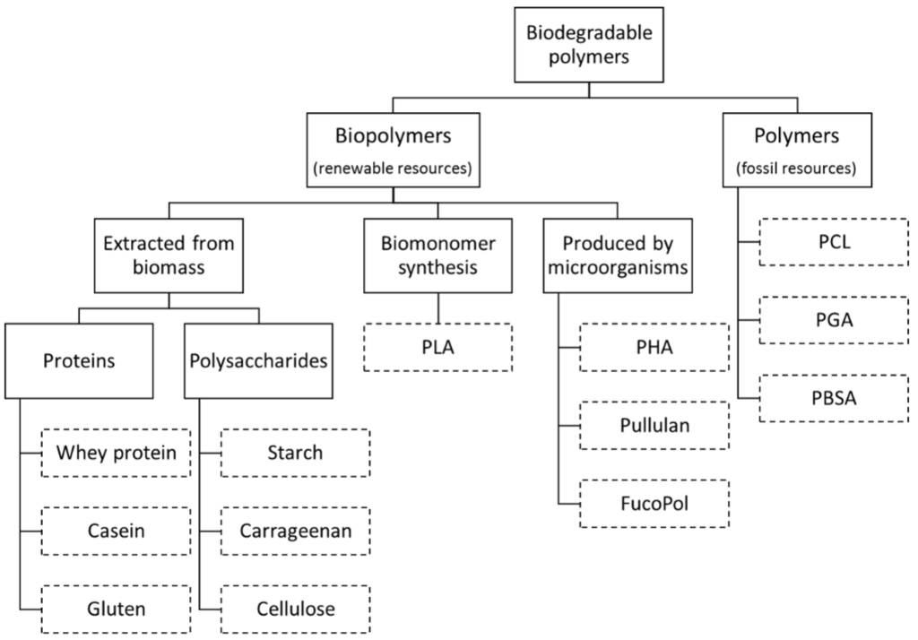 - Polymers produced by microorganisms, like some polysaccharides (e.g., gellan gum and pullulan) and polyhydroxyalkanoates (PHA) [14,15].