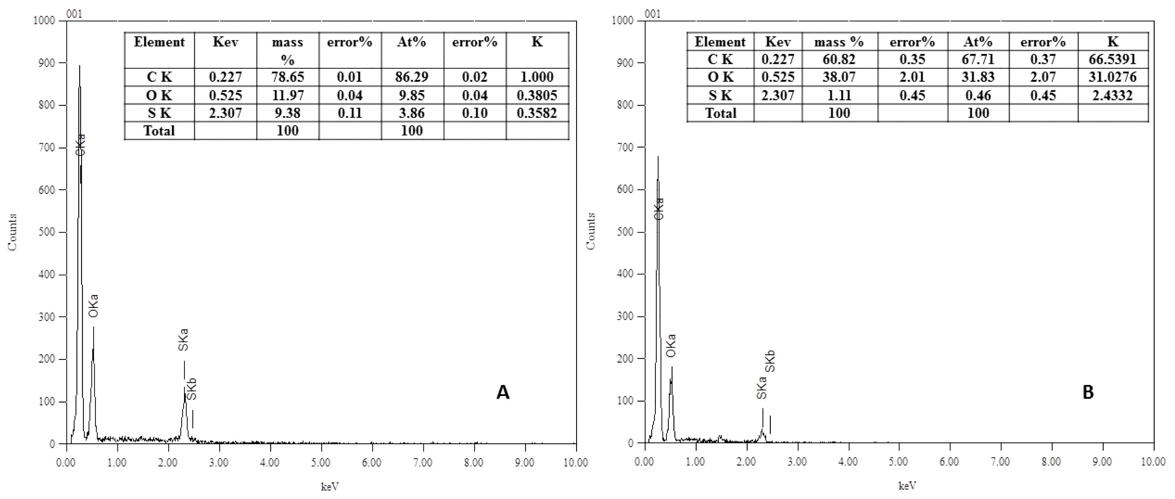 EDX analysis spectra of (A) Blank and (B) Modified real membrane using 10 mM ferulic acid, 0.5 U∙mL−1 laccase, 45 °C, pH 5 (0.1 M sodium acetate buffer) and 2 h modification time.