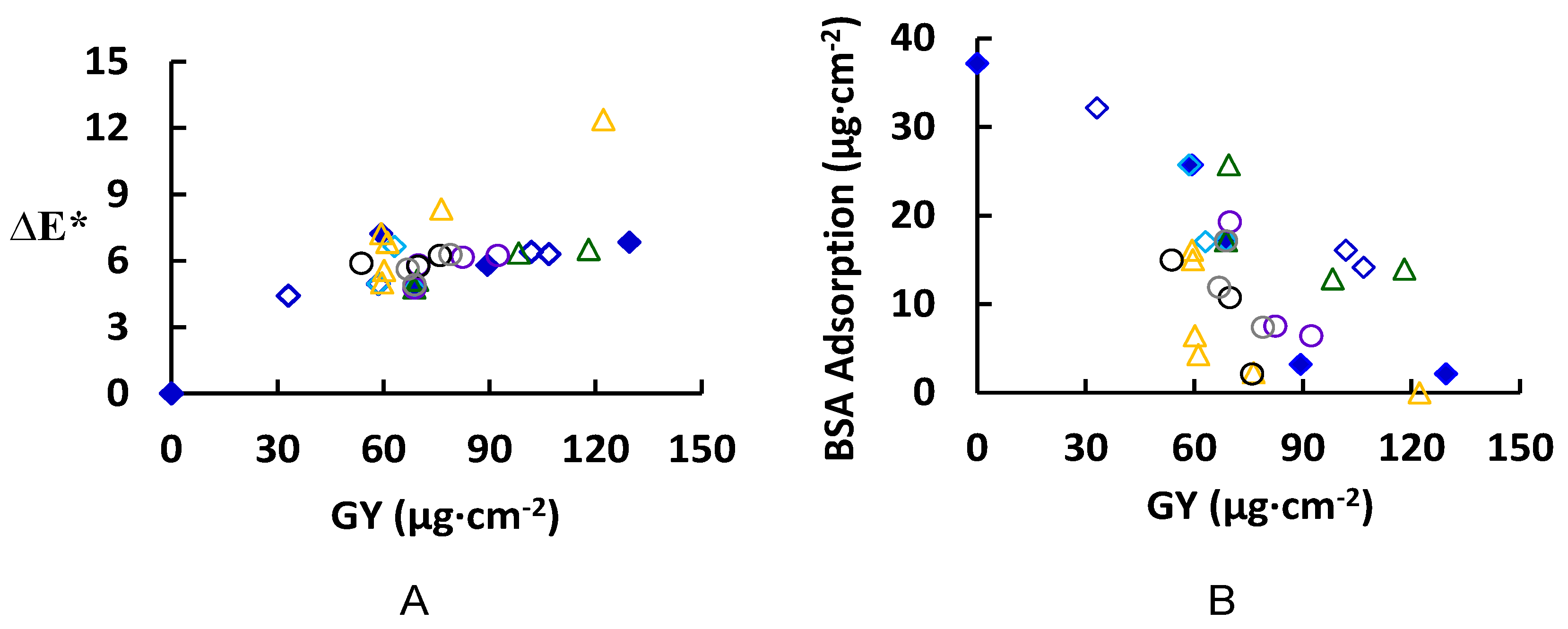 Membrane color change (∆E*) (A) and BSA adsorption (total adsorption equals reversible + irreversible adsorbed protein) (B) with grafting yield (GY); the common reaction condition is 4.8 mM ferulic acid, 0.5 U·mL−1 laccase, 2 h modification time, 25 °C, pH 5, and 0.1 M sodium acetate buffer. The following parameters were studied: modification time (0.5, 2, 8, and 24 h) with