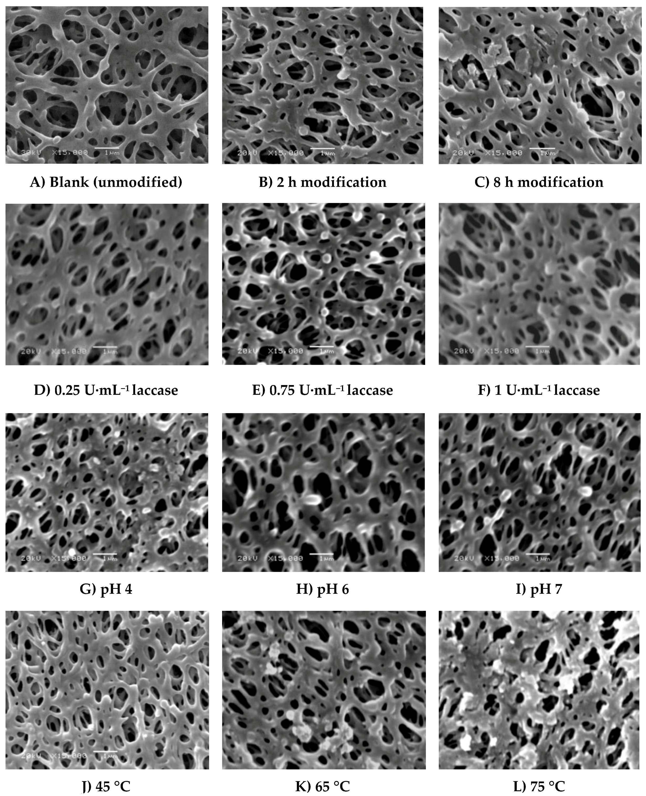SEM photos (15,000× magnification, 1 µm bar) of real (A) blank membrane and modified membranes under different modification conditions. Common modification condition is (B) 4.8 mM ferulic acid, 0.5 U∙mL−1 laccase, 25 °C, pH 5, 0.1 M sodium acetate buffer, 2 h modification time. The effect of different modification conditions was illustrated as follows: (C) modification time (8 h); (D–F) modified membranes using 0.25, 0.75 and 1 U∙mL−1 laccase concentrations, (G–I) modified membranes at pH 4, 6, and 7, (J–L) modified membranes at 45 °C, 65°C, and 75°C with 0.5 h modification time.