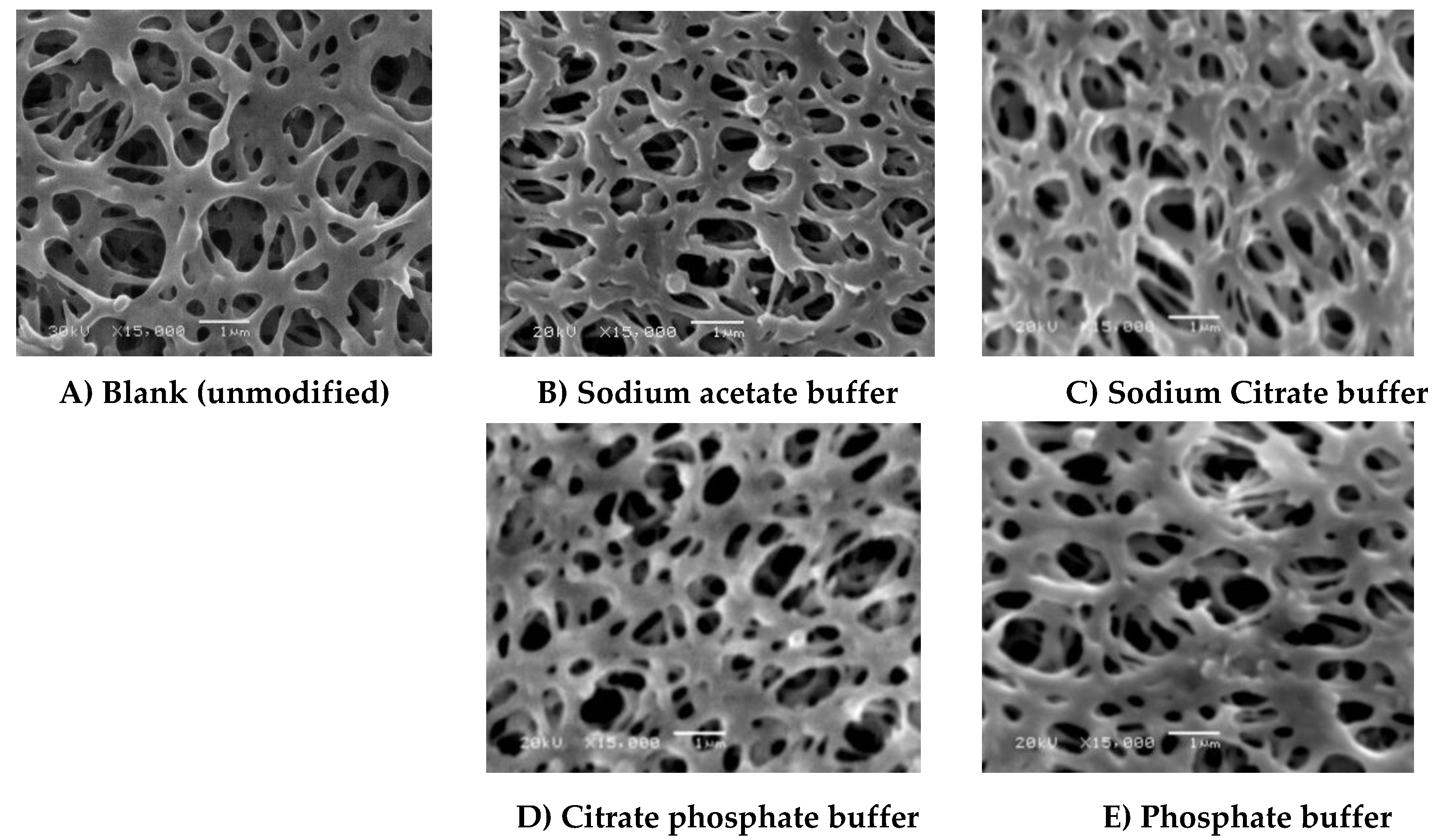 SEM photos (15,000× magnification, 1 µm bar) of (A) Blank membrane and (B–E) modified membranes using different buffers. Common modification condition are 4.8 mM ferulic acid, 0.5 U∙mL−1 laccase, 25 °C, pH 5 using 0.1 M buffer, and 2 h modification time: (B) Sodium acetate buffer; (C) Sodium citrate buffer; (D) citrate phosphate buffer and (E) phosphate buffer.