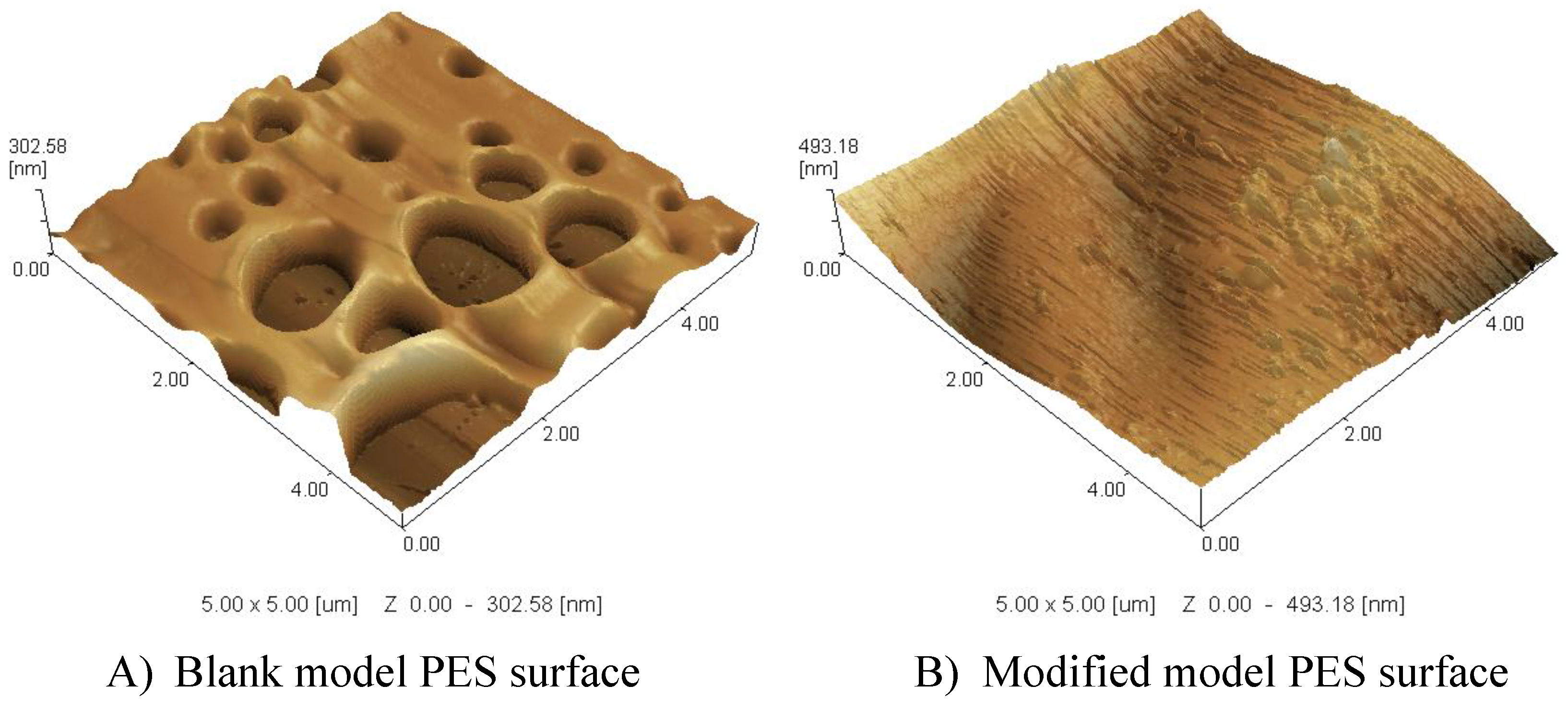 SPM 3D (5 µm × 5 µm) images of PES model surface (A) and modified model PES surfaces and (B) prepared at 10 mM ferulic acid, 0.5 U·mL−1 laccase, 45 °C, pH 5 (0.1 M sodium acetate buffer) and 2 h modification time.