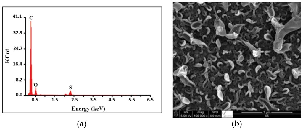 Images of the TFC reference (FT-30 membrane) by EDX and SEM portrayed in Figure 2a,b show that the surface roughness ranges between 25 and 34 nm. This is slightly rougher than that of the PS membrane (27–31 nm) [41] as indicated by the AFM images in Figure 3. The EDX spectrum shows that C, O, and S are the main elements exist in the TMC membrane.