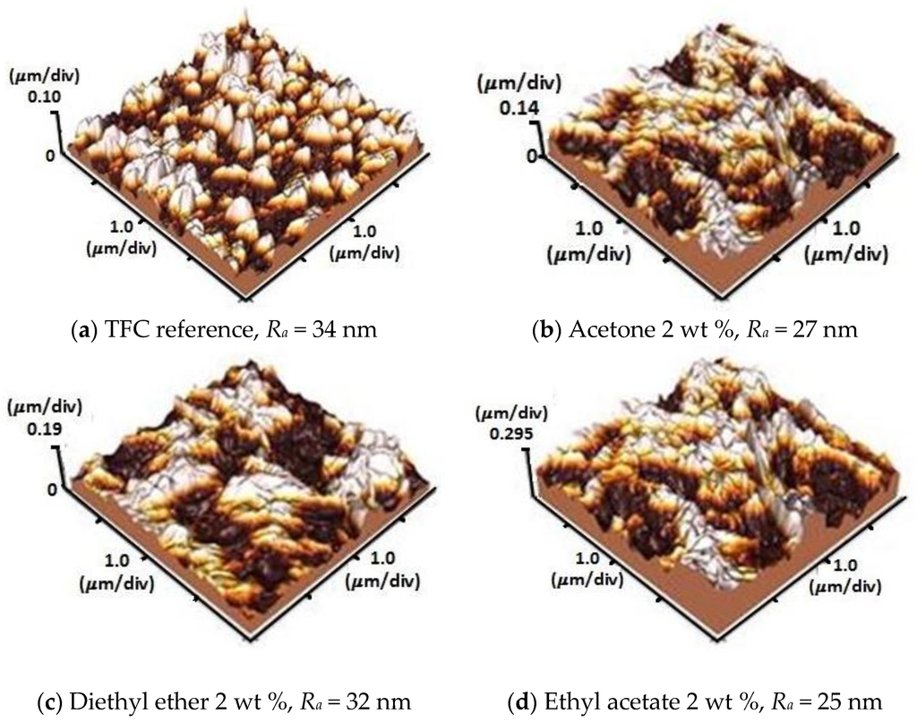 AFM images of formulated membranes with 2 wt % of co-solvents added (a) no co-solvent added; (b) acetone; (c) diethyl ether; and (d) ethyl acetate.