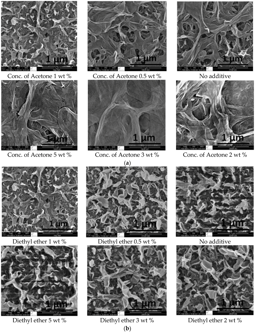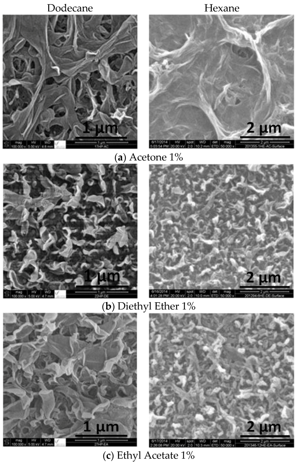 The comparison of the surface morphology for the membranes prepared with two different solvent, i.e., hexane as reported in [41] and dodecane (this study), at a co-solvents concentration (acetone, diethyl ether and ethyl acetate) of 1% is shown in Figure 5. The use of dodecane as solvent resulted in membrane with larger pore size (and hence the flux is expected to be larger as well) due to its reduced solubility (compared to hexane) with each of the three polar co-solvents giving to de-mixing phenomena [45]. Flux measurements and salt rejection are reported below in the permeate flux and salt rejection section. A comparison between the results of hexane and dodecane is reported and discussed as well.