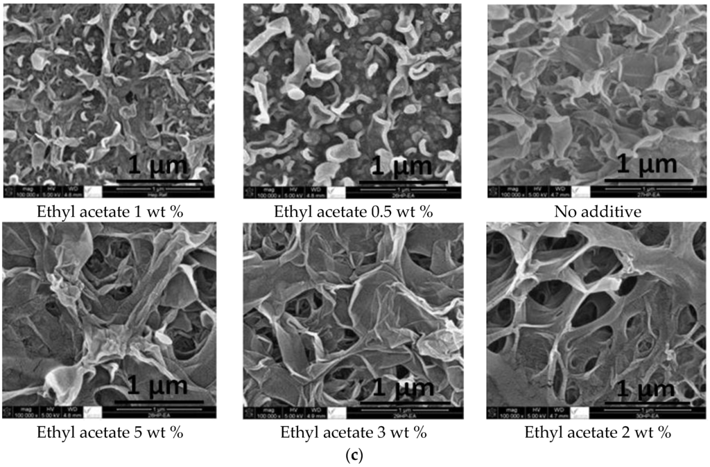 SEM images of the formulated membranes upon adding (a) acetone (b) diethyl ether (c) ethyl acetate.