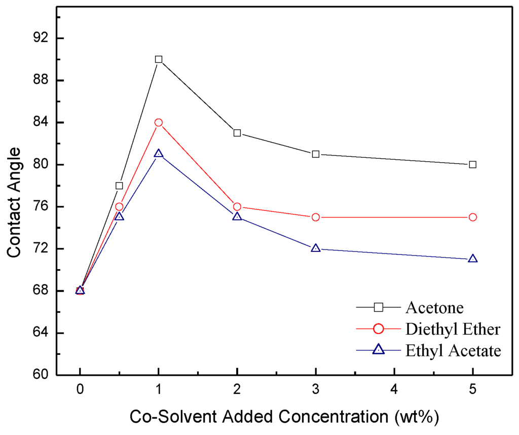 Measured contact angles for the co-solvents added as a function of their concentration are shown in Figure 6. It can be seen that acetone gives the highest contact angle followed by diethyl ether and ethyl acetate. For all measured membranes, the contact angle is < 90° indicating that they possess a hydrophilic property and hence they are less susceptible to fouling [46]. Figure 7 also shows that the contact angle for the three co-solvents tested goes through maxima at 1% co-solvent concentration. A similar trend was obtained for hexane with smaller contact angle at 1% co-solvent concentration. However, at larger and smaller co-solvent concentrations, the contact angle for dodecane solvent is smaller [41].